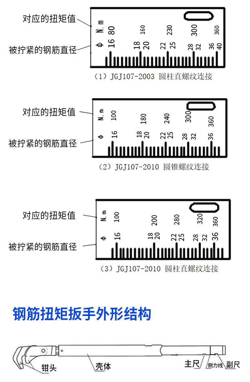 本產(chǎn)品適用于鋼筋直徑中16~$4Omm,扭矩范圍在100~360 N.m的鋼筋螺紋連接。主尺示值窗顯示使用的鋼筋直徑與對應的扭矩值,每一小格10N.m,副尺微調(diào)窗口用于微調(diào),每一小格是1N.m。